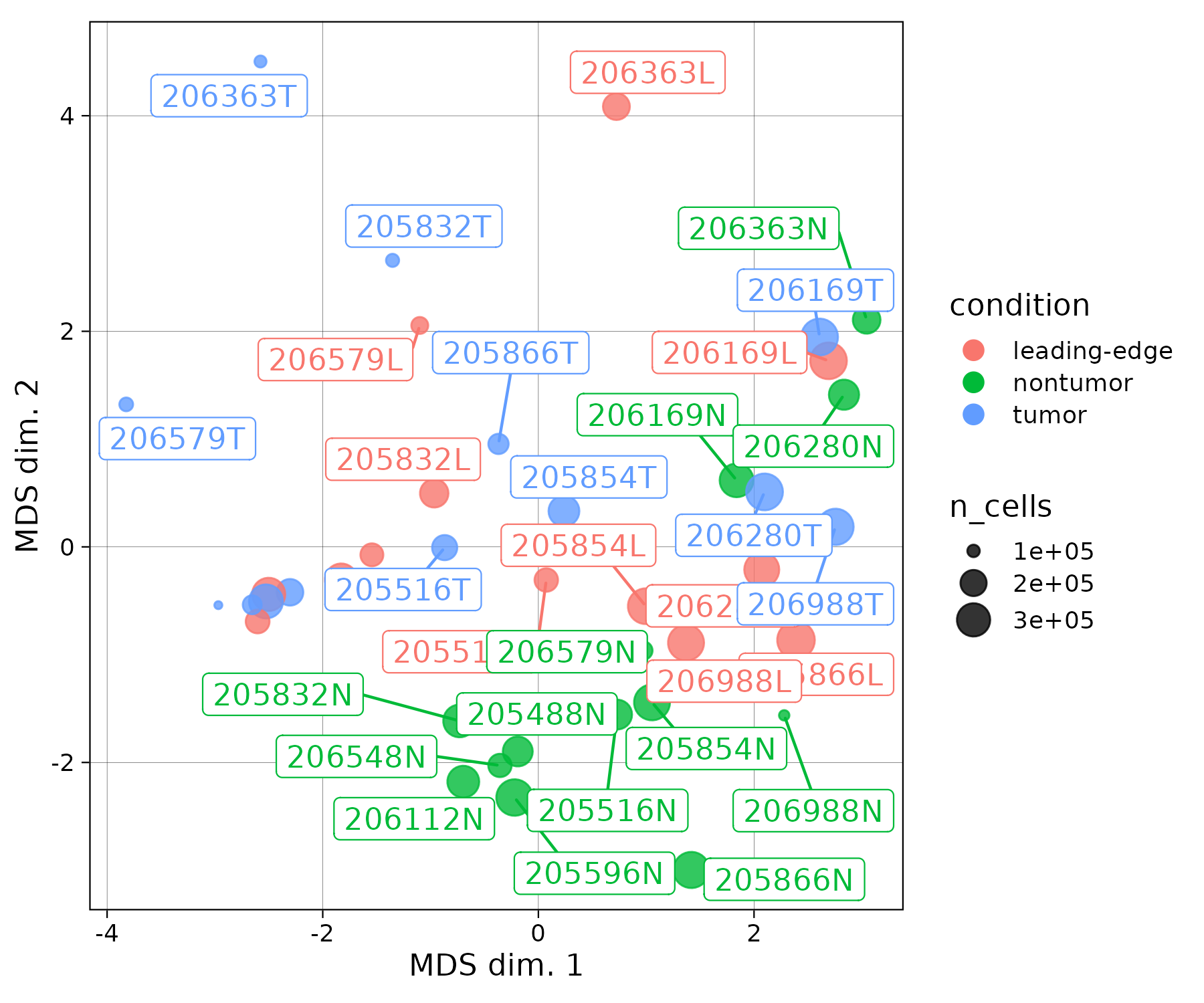 MDS plot showing similarities between samples in dataset. Colored by sample conditions.