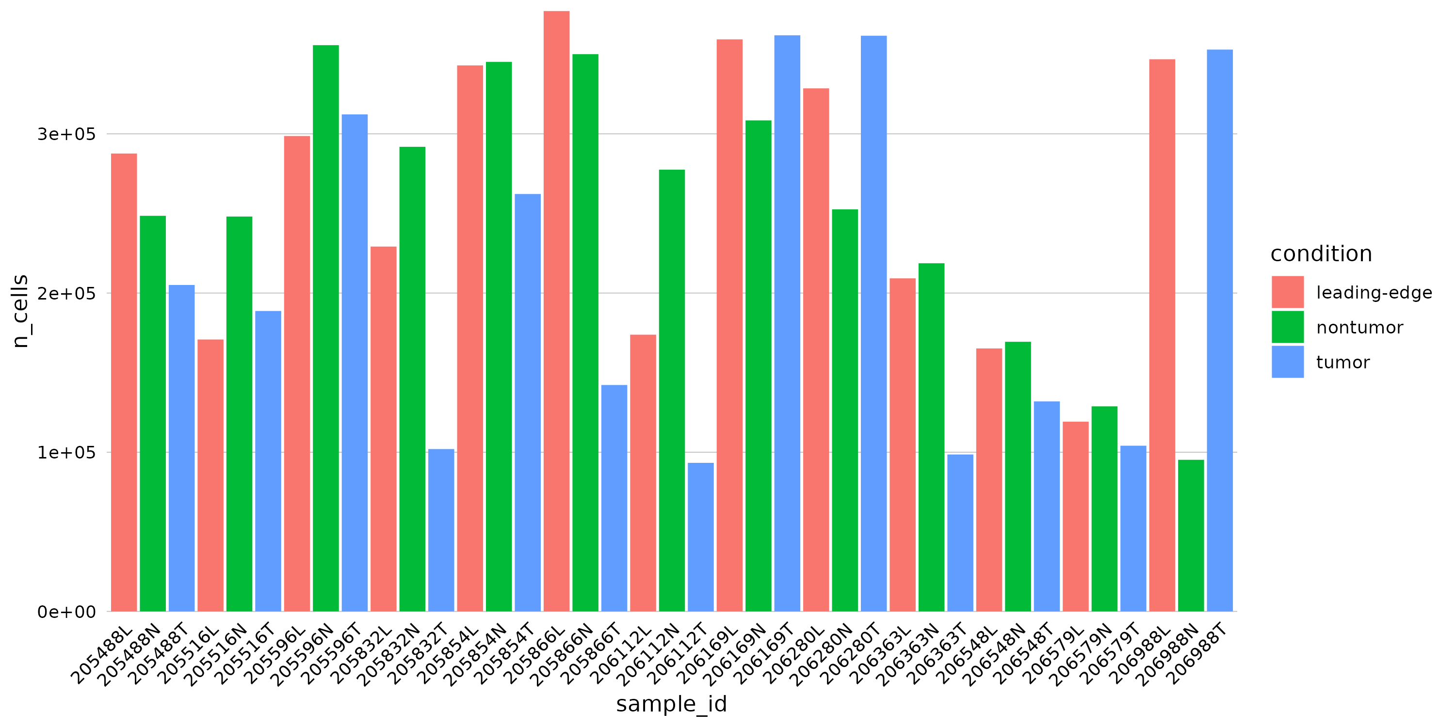 Barplot showing the number of cells measured for each sample in the dataset. Bars are colored by experimental condition.