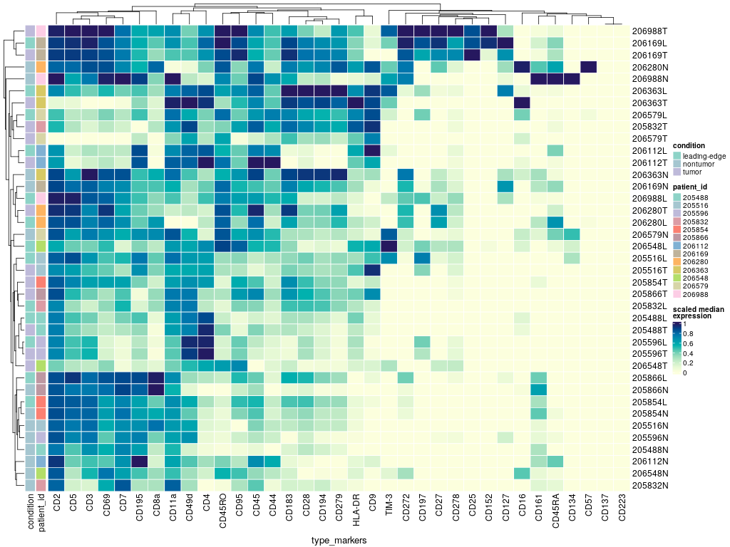 Clustering of samples (rows) and markers (columns) based on the median (arcsinh-transformed) marker expression across all cells measured for each sample. Colored by experimental condition. Dendrograms are based on hierarchical clustering with Euclidean distance metric and average linkage