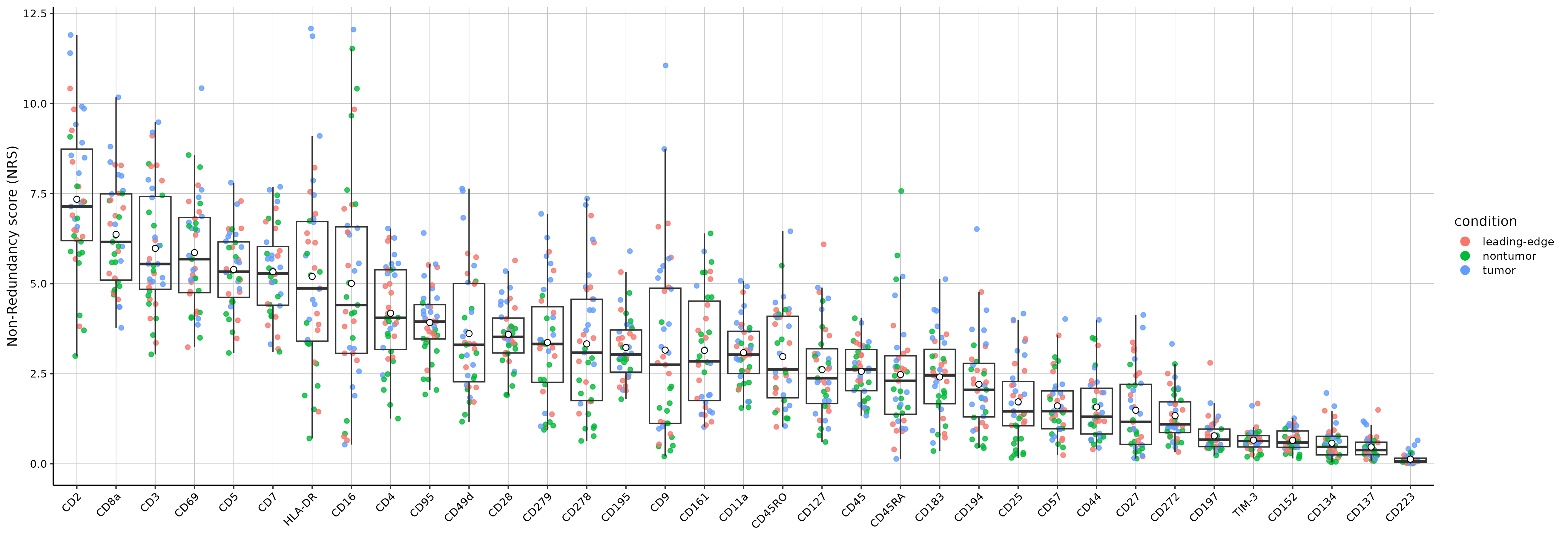 Non-redundancy scores for markers and all samples in the dataset. The points represent the per-sample NR scores (colored by experimental conditions), while open white circles indicate the mean NR scores from all the samples. Markers on the x-axis are sorted according to the decreasing average NRS