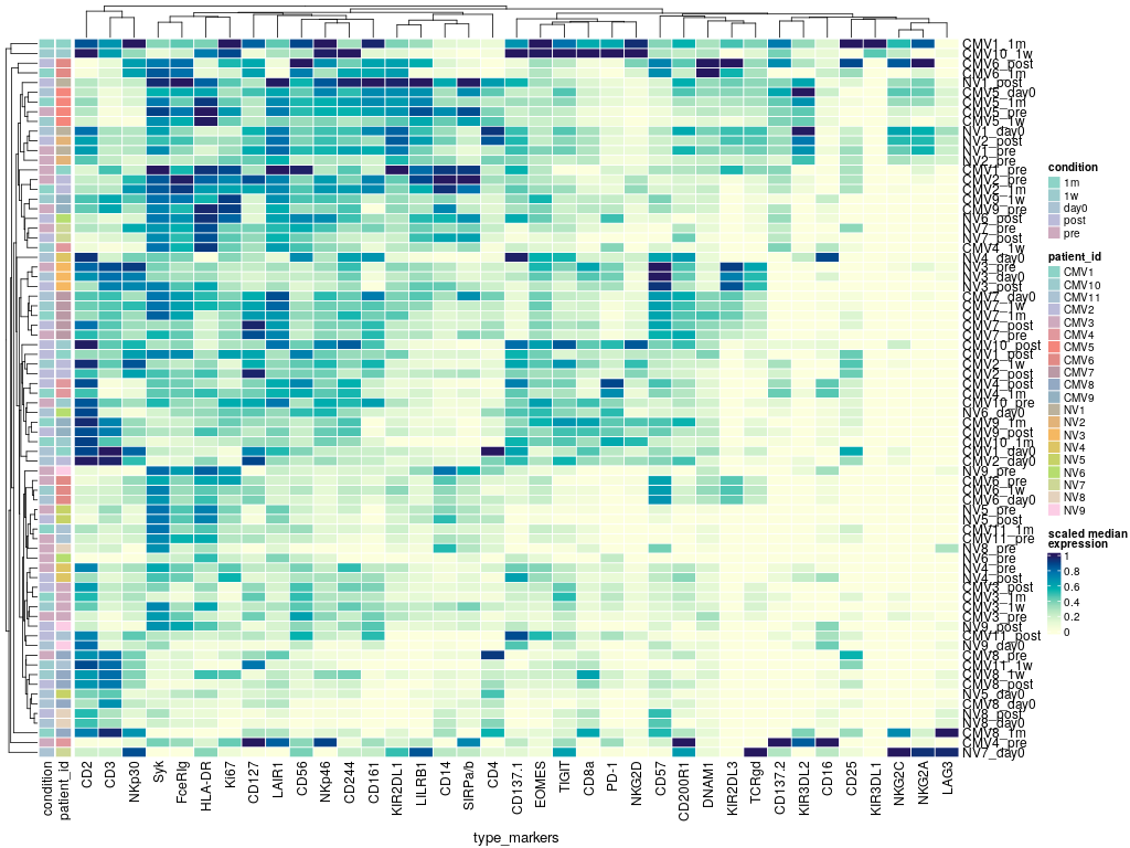 This dataset includes PBMC CyTOF files by NK-centric panel (singlet cells or live cells after debarcoding) for 11 CMV viremic patients and 9 non-viremic patients. Each patient have 3 to 5 files, which indicate different time points (day 0 of transplantation, at a time point prior to viremia, and then post-viremia at approximately 1-week, 1-month, and long-term (>1 month)).