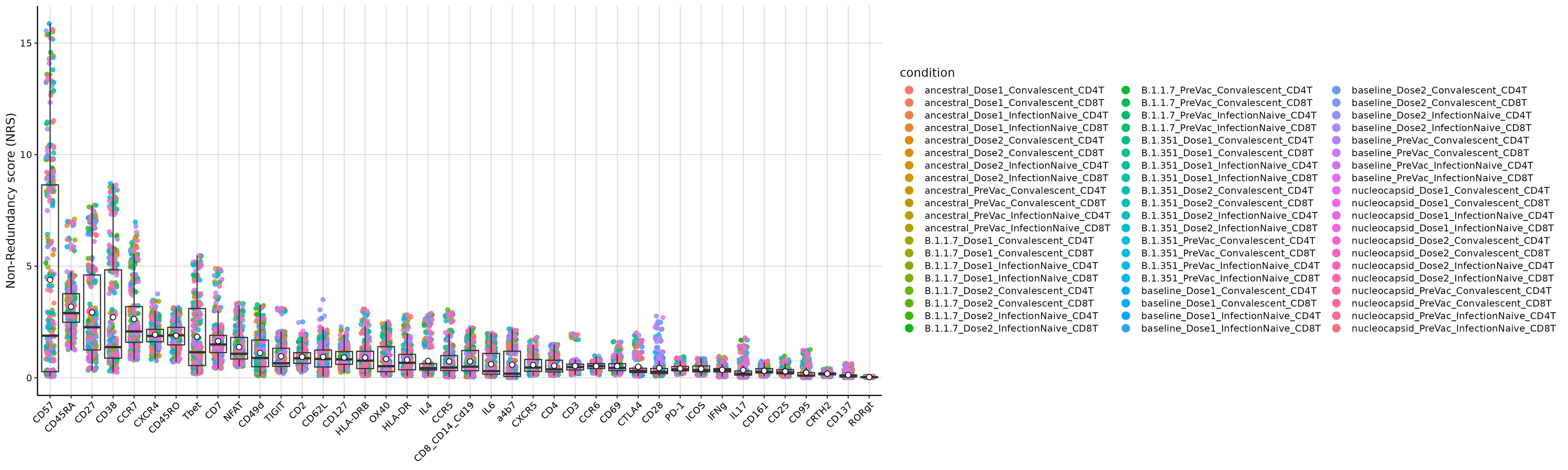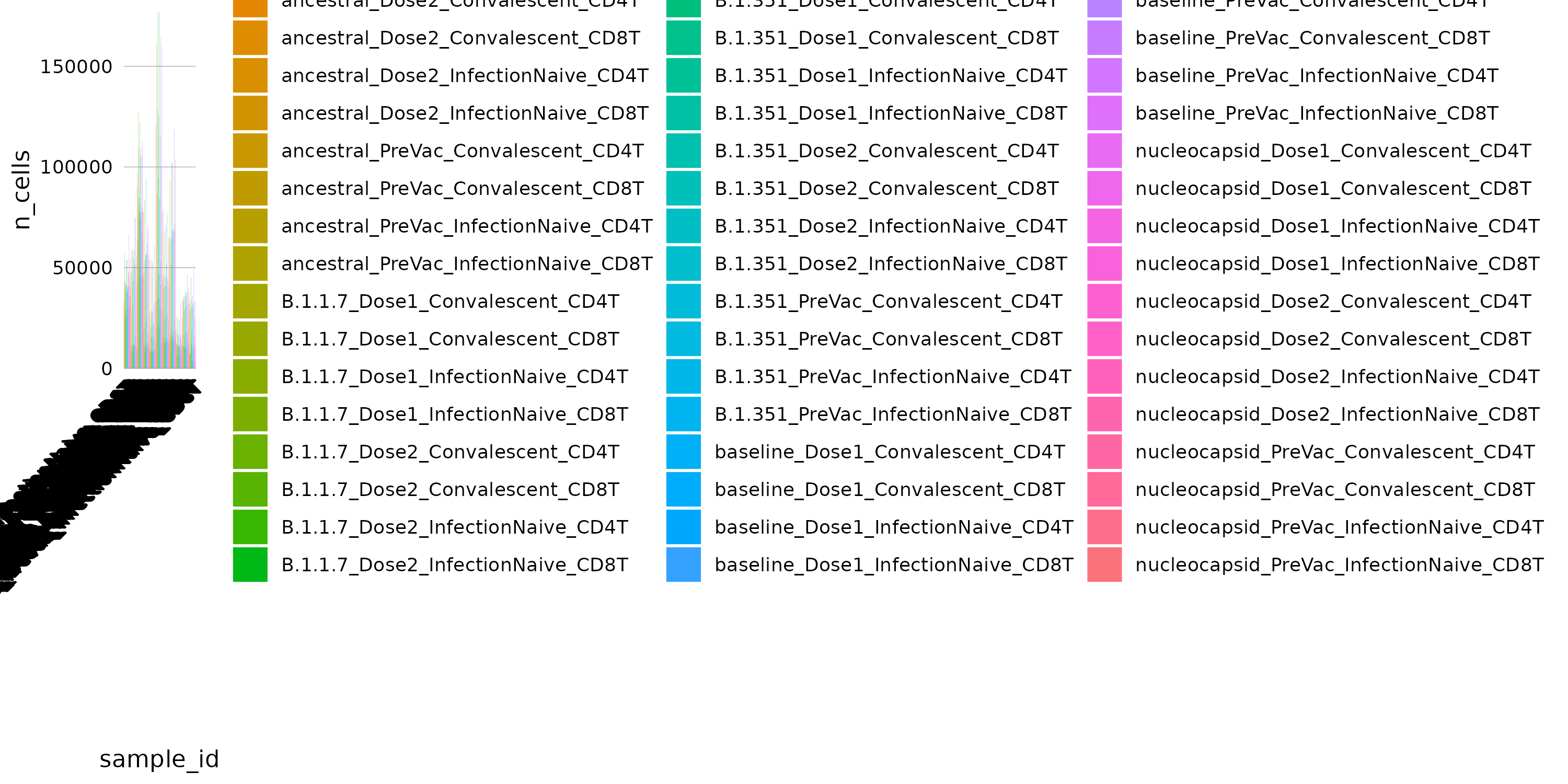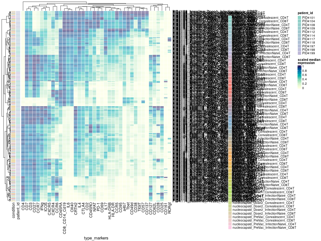 Focusing on the T cell response, we conducted a longitudinal study of infection-naïve and COVID-19 convalescent donors before vaccination and after their first and second vaccine doses, using a high-parameter CyTOF analysis to phenotype their SARS- CoV-2- specific T cells. Vaccine-elicited spike-specific T cells responded similarly to stim- ulation by spike epitopes from the ancestral, B.1.1.7 and B.1.351 variant strains, both in terms of cell numbers and phenotypes. For this study, a total of 120 specimens were analyzed by CyTOF. Each specimen included both CD4+ and CD8+ T cells. For each specimen, we gated separately on events corresponding to CD4+ T cells (live, singlet CD3+ CD19- CD4+ CD8-) and CD8+ T cells (live, singlet CD3+ CD19- CD4 CD8+), and exported the files as 240 individual FCS files. Included are 326 FCS files total from 165 different CyTOF specimens total. Half of the FCS files correspond to pre-gated live, singlet CD4+ T cells, and the other half of the correspond to pre-gated live, singlet CD8+ T cells. Eight donors vaccinated with the SARS-CoV-2 mRNA vaccines are represented with the data. Half are SARS-CoV-2 infection-naïve, and the other half are COVID-19 convalescents. Three longitudinal specimens are available for each donor: pre-vaccination, ~2 weeks after the first mRNA vaccination dose, and ~2 weeks after the second mRNA vaccination dose. For each specimen, 5 conditions were analyzed: baseline, and following 6-hour stimulation with overlapping 15-mer peptides from ancestral spike, B.1.1.7 spike, B.1.351 spike, or ancestral nucleocapsid. All stimulated samples were pre-gated on the spike-specific T cells based on IFNg production. In total, we analyzed CD4+ and CD8+ T cells from 11 donors x 3 timepoints x 5 conditions = 165 specimens.